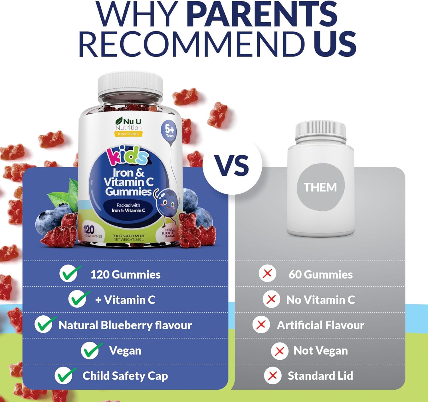 Each serving provides 7 mg of Iron and 10 mg of Vitamin C, supporting energy, cognitive development, and immune function — all in a vegan, chewable gummy bear.